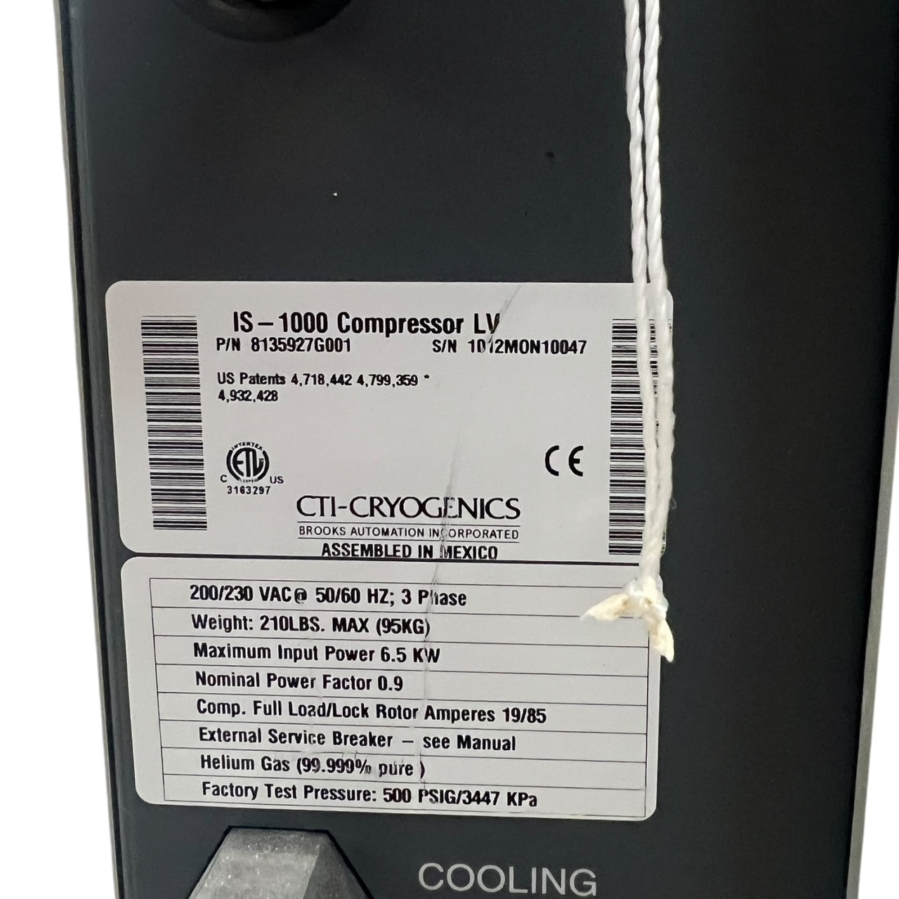 CTI-CRYOGENICS IS 1000 COMPRESSOR LV LAM RESEARCH 8135927G001 WATER COOLED